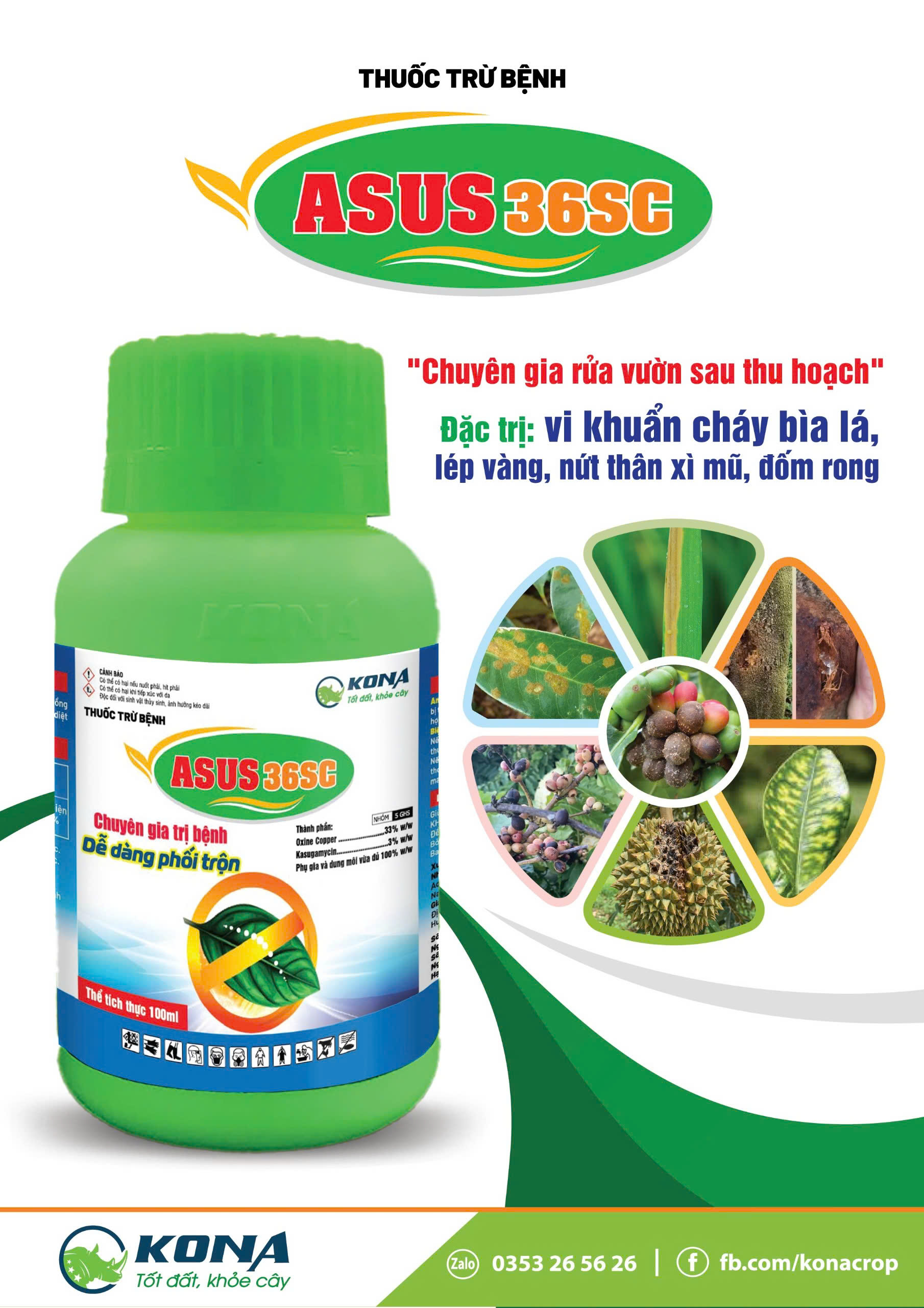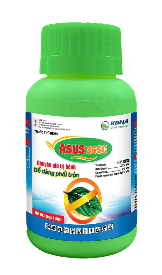 ASUS 36SC là sản phẩm thuốc trừ bệnh mới của KONA, kết hợp giữa Oxine Copper và Kasugamycin – hai hoạt chất có phổ tác động rộng, hiệu quả cao trong việc diệt khuẩn và nấm. Sản phẩm được đăng ký xử lý nhiều bệnh hại trên các cây trồng chủ lực như khoai tây, lạc, lúa, cà phê, sầu riêng, cà chua…